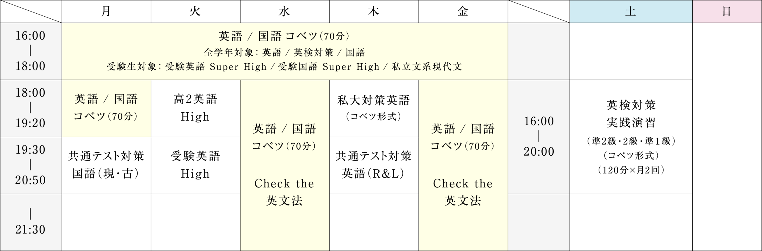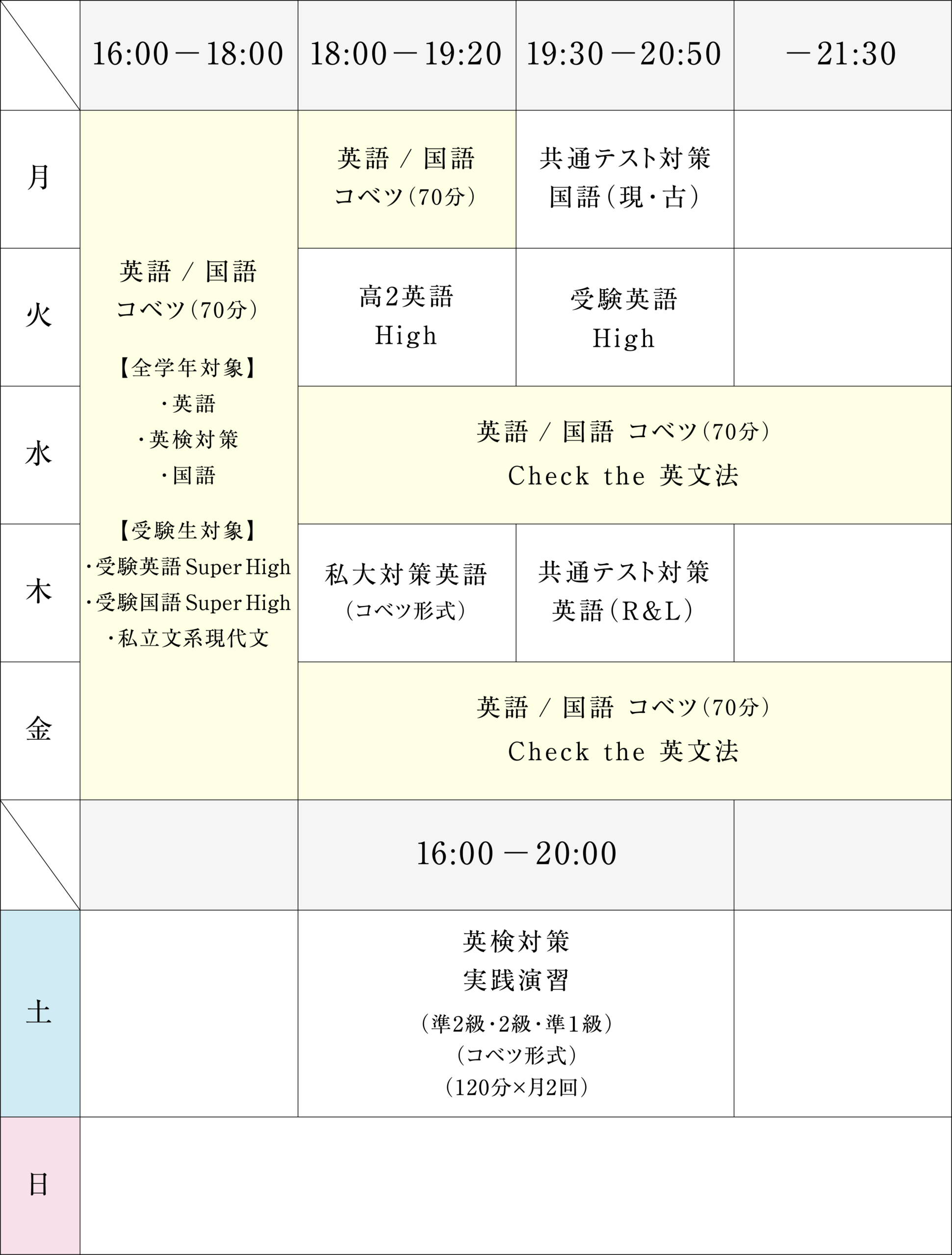- ※平常授業のほかに、春・夏・冬の季節講座(別途授業料)、共通テスト前など特別講座(別途授業料)も開講予定です。
